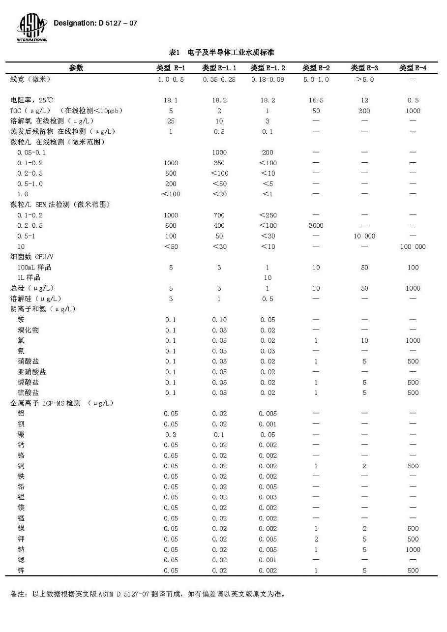 在電子工業(yè)的生產(chǎn)工藝中,相當(dāng)多的工序要進(jìn)行化學(xué)處理,而電子產(chǎn)品的清洗和化學(xué)藥劑的制備都直接或間接地要利用到純水或超純水。隨著電子工業(yè)的發(fā)展,尤其是以超大規(guī)模集成電路為代表的半導(dǎo)體產(chǎn)業(yè)的發(fā)展,對純水的水質(zhì)提出了更高的要求,下表所列為美國材料測試協(xié)會(ASTM)根據(jù)半導(dǎo)體特性而制定的超純水水質(zhì)要求。