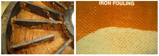 氫氧化鐵膠體在保安過濾器濾芯以及納濾的進口端膜元件上會快速形成嚴重的棕紅色鐵氧化物膠體累積,致使系統完全無法運行。在華北某焦化廢水工程中,曾經發現過超濾產水的濁度~0.1 NTU,而再次從納濾進水箱抽出來后,濁度達到了1~2NTU,其結果是第一支膜元件嚴重膠體顆粒物污染,稱重達40kg。